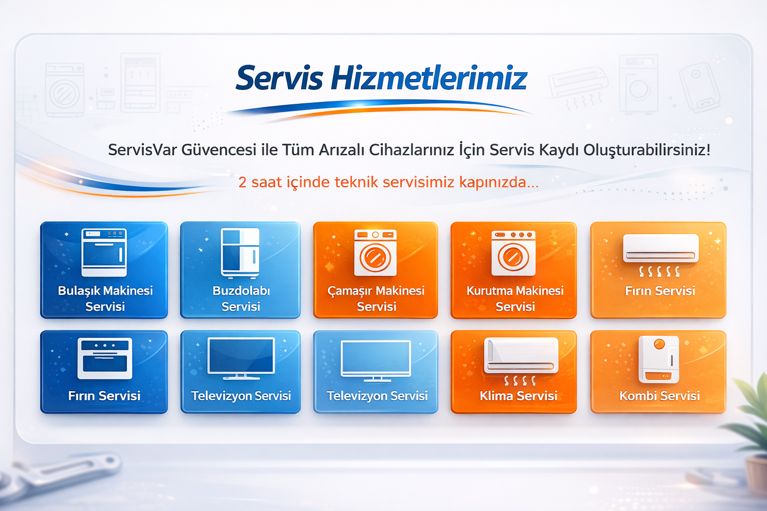 Beyaz eşya, kombi, klima ve TV servis ihtiyaçlarınız için hızlı, güvenilir ve yerinde çözümler sunuyoruz.